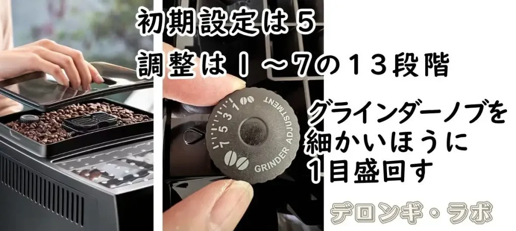 初期設定は「5」ですが、薄ければさらに細かくします。(注:グラインダーの設定は稼働中のみ。1度の調整で動かすのは1目盛が推奨されています。)