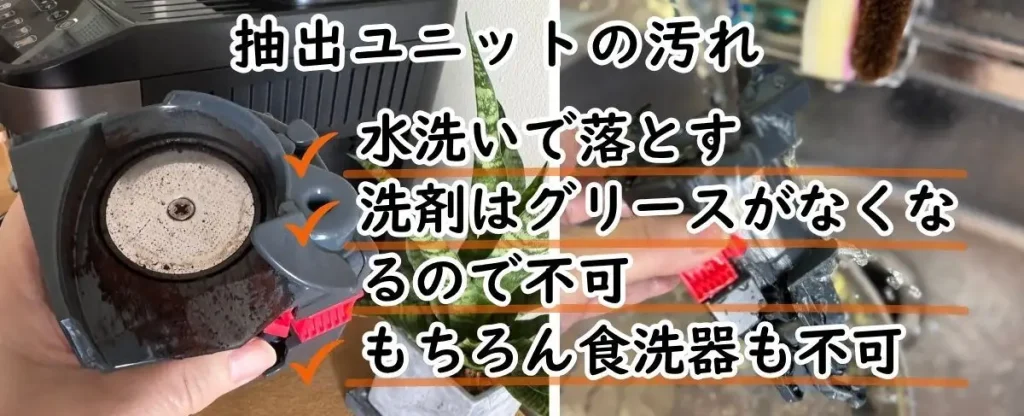 抽出ユニットに付着したコーヒーオイルが酸化すると、古い油特有の雑味や不快な臭いがコーヒーに移ります。